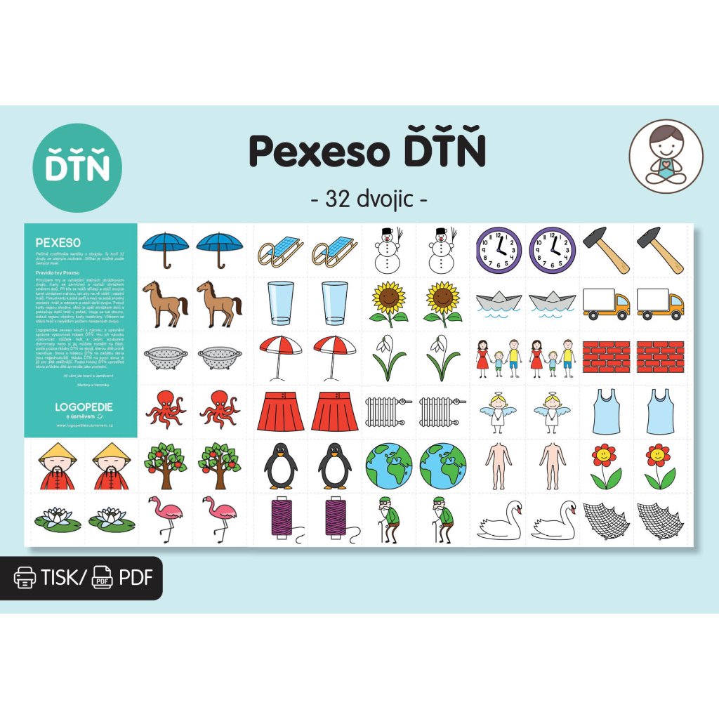 Logopedické pexeso slouží k nácviku a upevnění správné výslovnosti hlásek ĎŤŇ. Hru při nácviku výslovnosti můžete hrát s celým souborem dohromady nebo si jej můžete rozdělit na části podle pozice hlásky ĎŤŇ ve slově, kterou dítě právě nacvičuje. Slova s hláskou ĎŤŇ na začátku slova jsou nejjednodušší, hláska ĎŤŇ na konci slova je již pro dítě obtížnější. Pozici hlásky ĎŤŇ uprostřed slova zvládne dítě zpravidla jako poslední.