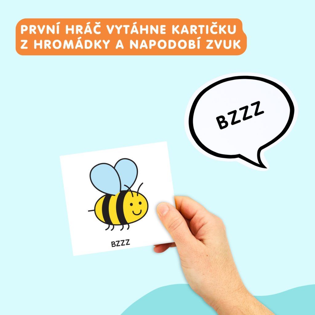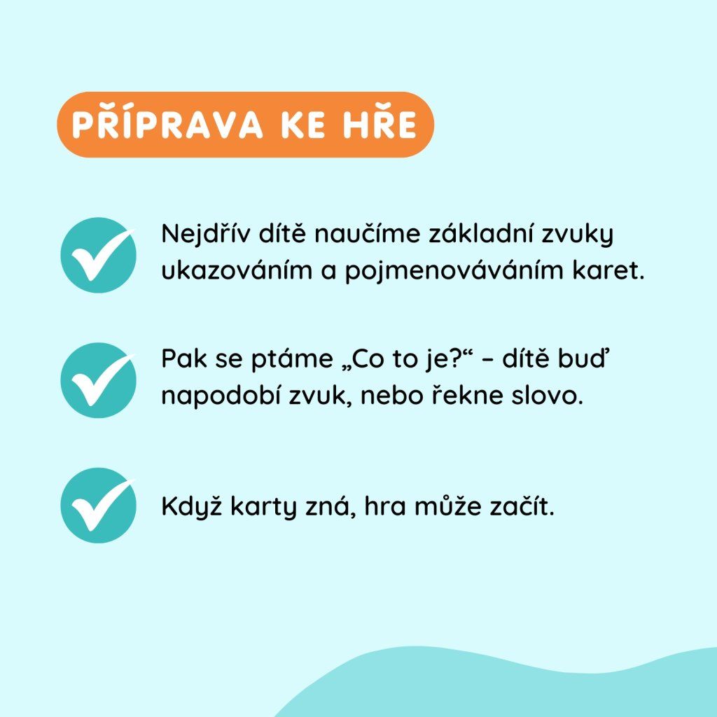 Než začneme hrát, je potřeba nejprve obecné zvuky dítě naučit. Ukazujeme dítěti jednotlivé karty a pojmenováváme je uvedenými zvuky. Následně se ptáme dítěte otázkou CO TO JE? Děti mají za úkol buď udělat zvuk, nebo říct odpovídající slovo. V případě, že již dítě karty zná, můžeme začít hrát.