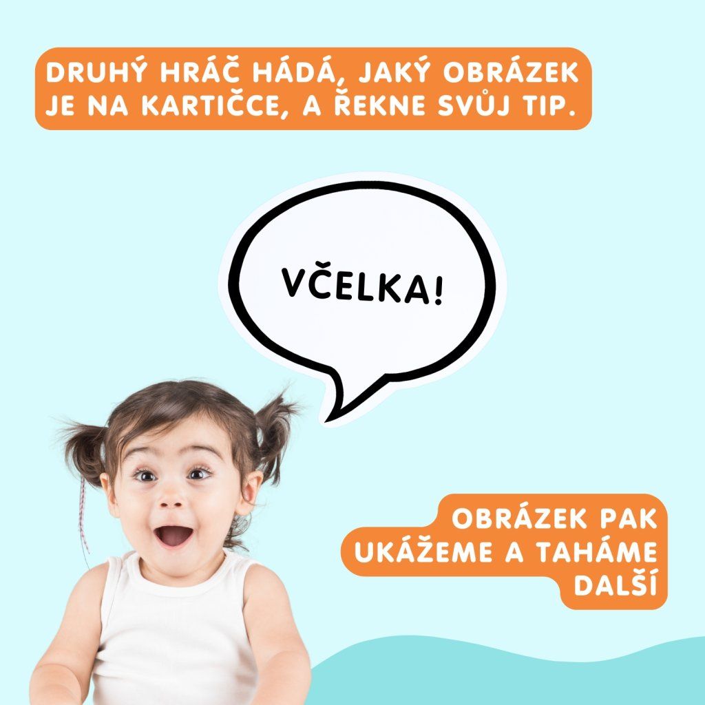 2. Hádej, co jsem? – Vystřídáme se s dítětem. Teď si před sebe rodič položí hromádku karet rubem nahoru. Následně si obrázky tahá tak, aby na ně dítě nevidělo, a udělá zvuk, který k obrázku patří. Dítě má za úkol poznat zvíře nebo věc na obrázku a pojmenovat ho podle vysloveného zvuku.