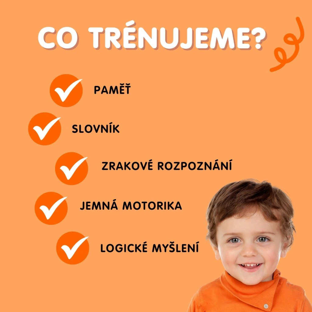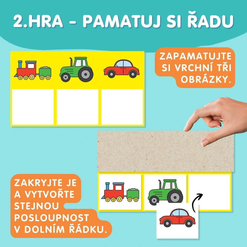2. PAMATUJ SI (str. 2–3, žlutá šablona) – Podívej se na tři vrchní obrázky žluté šablony a zapamatuj si je. Poté si je zakryj a do prazdných čtverců šablony vyskládej obrázky tak, jak si je pamatuješ. Cílem je vyskládat obrázky i ve stejném pořadí. Do prázdných čtverců umisťujeme obrázky z pexesa.
