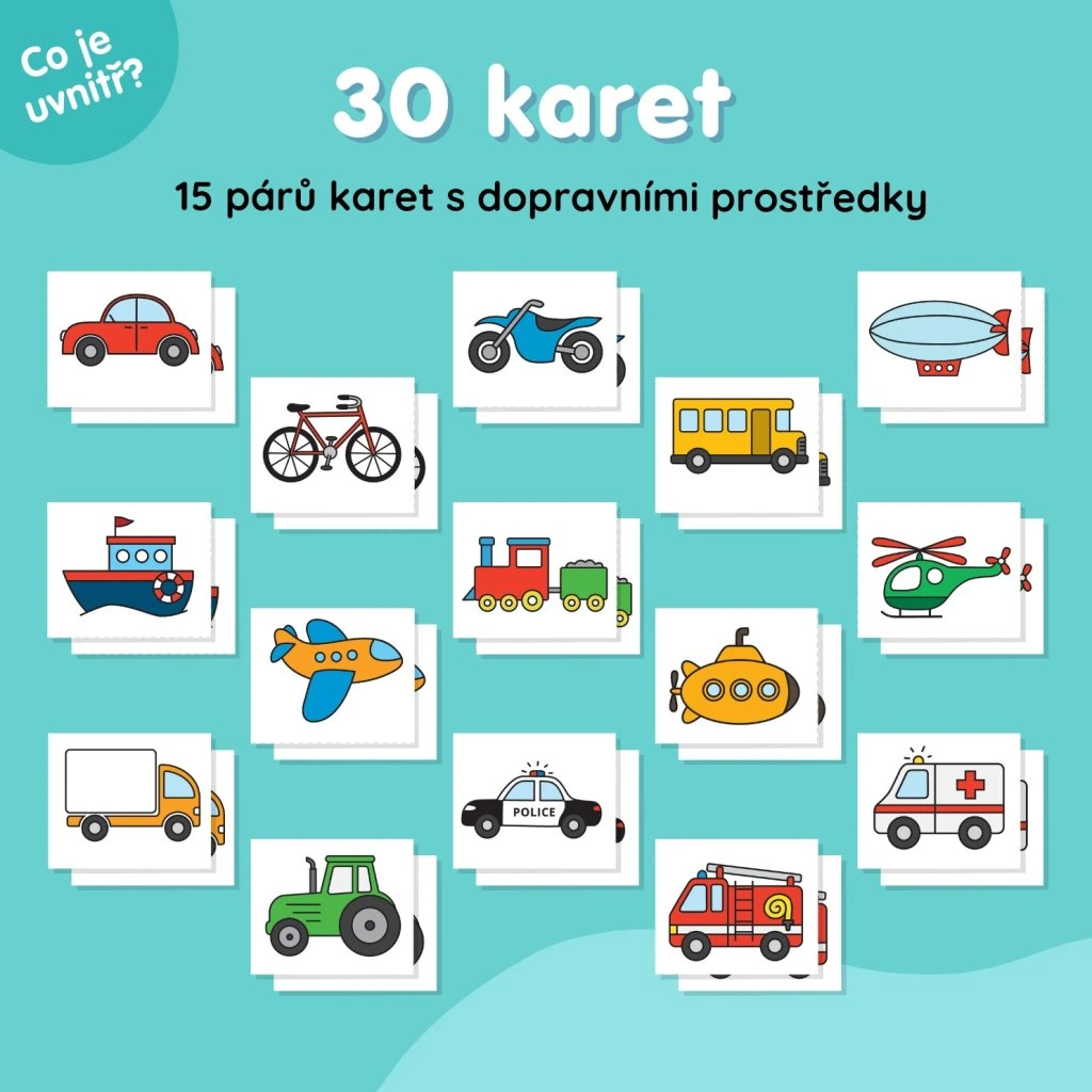 Sada obsahuje celkem 8 listů karet a pracovních šablon, které dětem přibližují svět dopravních prostředků zábavnou formou. Najdete v ní obrázkové karty ve dvojicích, šablony se stínovými i barevnými obrázky, materiály pro rozvoj zrakové paměti, poznávání barev i podporu jazykových dovedností – včetně rozšiřování slovní zásoby a procvičování otázky KDE a správného používání předložek.