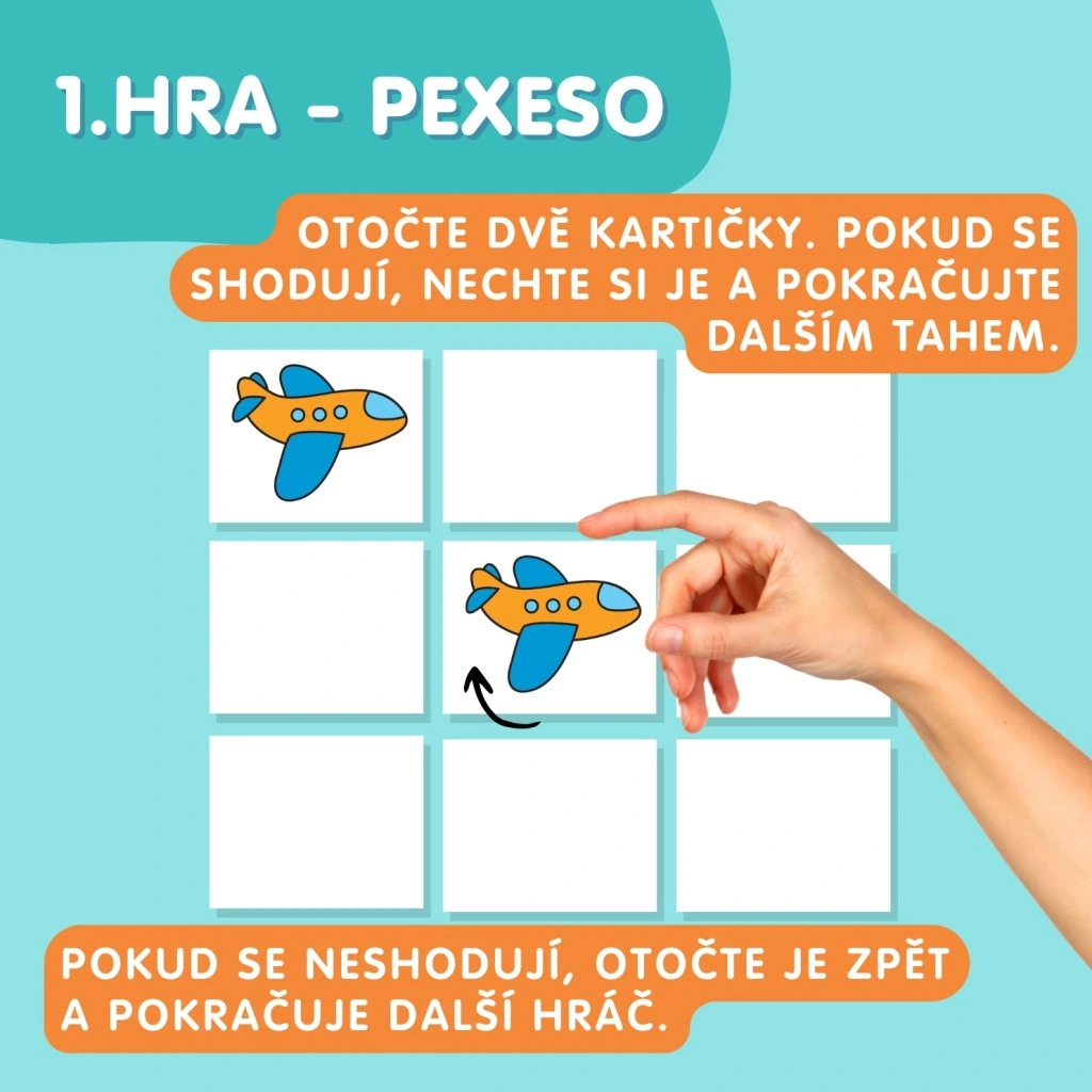 1. PEXESO (str. 2–3) – Tyto obrázky slouží jako slovník ke všem hrám. S dvojicemi karet dopravních prostředků lze hrát klasické pexeso. Současně můžete slova pojmenovávat v jednotném a množném čísle.
