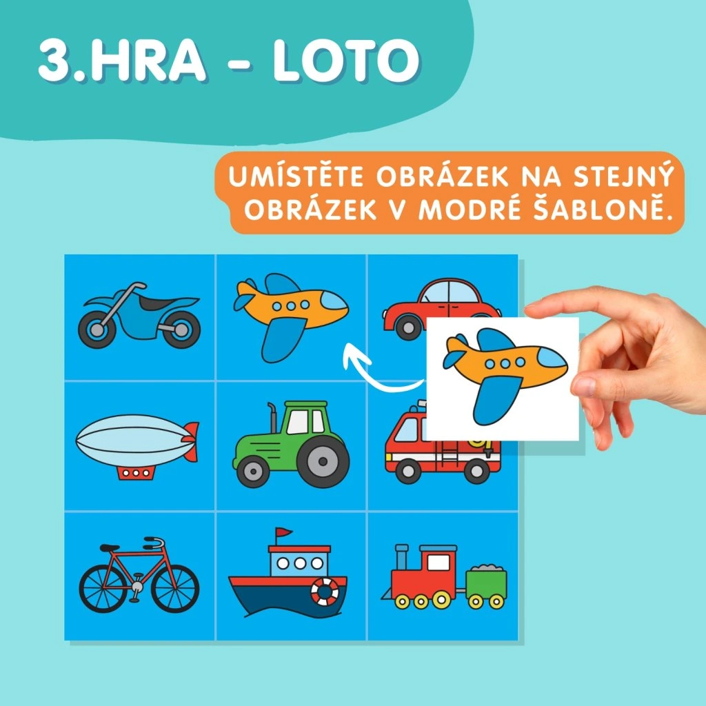 3. LOTO (str. 4–5, modrá šablona) – Před dítě položte celou sadu dopravních prostředků z pexesa. Dítě má za úkol vyhledat v souboru obrázků ty, které jsou na modré šabloně a překrýt jeden obrázek druhým. Např. auto dáme na auto.