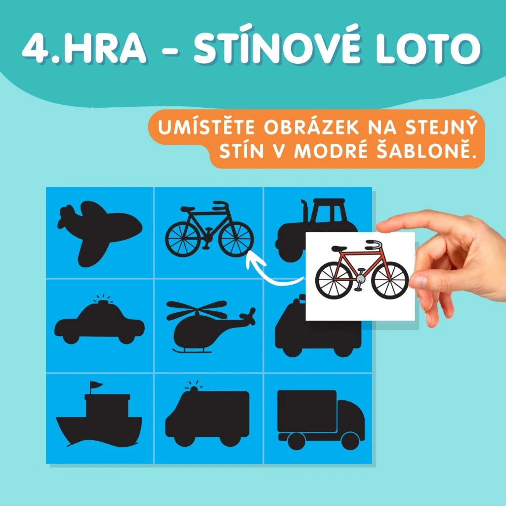 4. STÍNOVÉ LOTO (str. 6–7, modrá šablona) – Hrajeme stejně jako klasické loto (bod 3), dítě místo barevných obrázků překrývá jejich stíny.