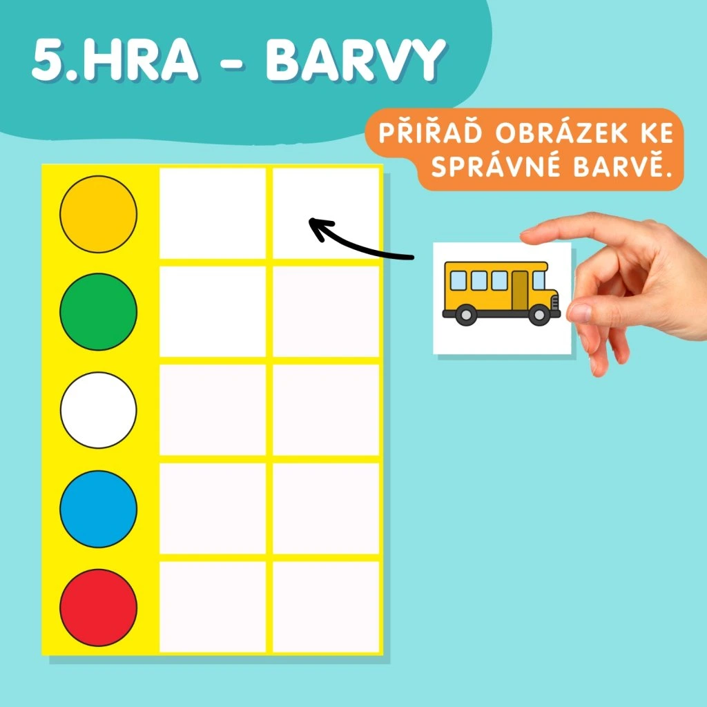 5. BARVY (str. 8) – K dané barvě dítě vyhledá dva obrázky dopravních prostředků se stejnou barvou. Např. červená – hasiči a auto.