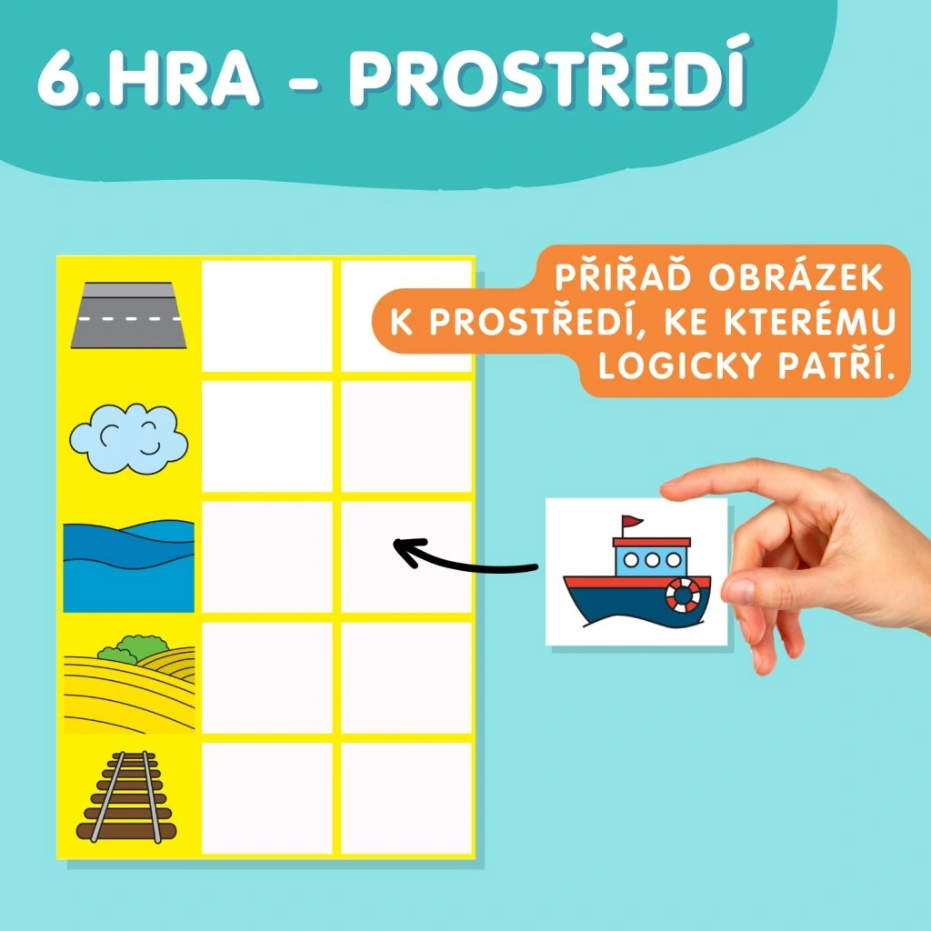 6. PROSTŘEDÍ A PŘEDLOŽKY (str. 9) – K danému prostředí dítě přiřadí ty dopravní prostředky, které s ním logicky souvisejí, např. moře – loď a ponorka. Při této hře si dítě procvičuje také předložky, proto používáme otázky KDE? a ptáme se dítěte např. „Kde je loď? Kde je traktor?“