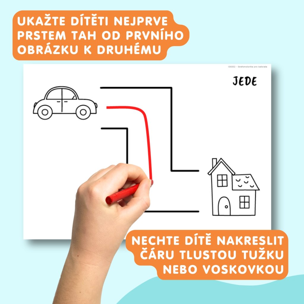 Cestičku také můžete vymodelovat modelínou nebo vyskládat kamínky, fazolkami, vysypat pískem. Tužka přichází na řadu až poté. Šířka cesty je dostatečná na to, aby se do ní batole trefilo. Pokud se to nestane, je to v pořádku a práci dítěte nijak nehodnoťte, učí se. Kresbu doprovoďte uvedeným slovem, které najdete v horní části obrázku. K pojmenování pohybu, který dítě tahem zobrazuje, motivujte i dítě tím, že ho budete vícekrát opakovat. A poté, co dítě kresbu dokončí, můžete mu položit otázku. Např. Co dělá myška? Odpověď zní: Hamá :).